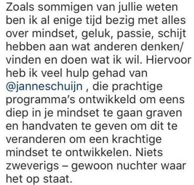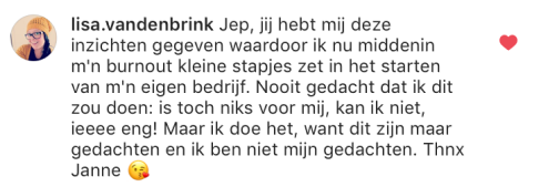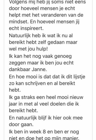 Mijn naam is Janne: mindsetcoach, moeder, ervaringsdeskundige & auteur van de bestseller ;-) 'Wat nou als het ook anders kan?'. Ik heb in 5 jaar tijd al talloze mensen mogen helpen bij het creëren van een krachtige mindset en het bereiken van hun doelen. In de Mindshift Methode hielpen we hen om een leven voor zichzelf te creëren waarin ze zich niet langer laten tegenhouden door hun eigen belemmerende gedachten of juist wat anderen van ze vinden of verwachten. Ik weet wat het veranderen van mijn kijk op de wereld - en mijzelf - voor MIJ heeft gedaan (alles!), en daarom gun ik het anderen ook zo. Mindshift is een manier om rust in je hoofd, balans en zelfvertrouwen te creëren in plaats van de dagelijks chaos en twijfels. Een methode die er voor zorgt dat je zelf de touwtjes in handen gaat nemen en je niet meer laat leiden en laat tegenhouden door dingen als uitstelgedrag, angst en perfectionisme.